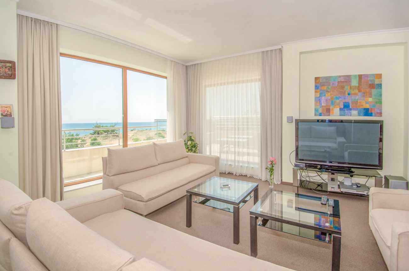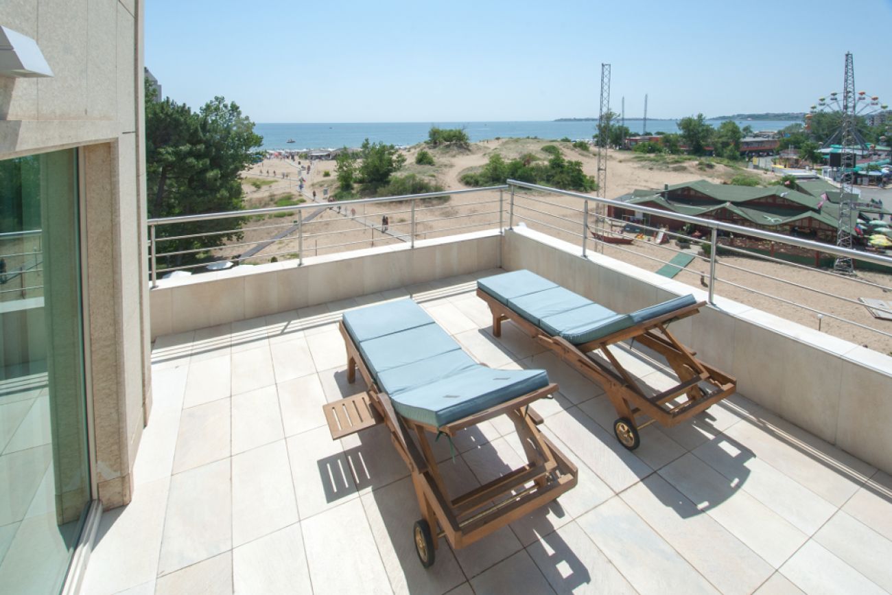 VIP апартамент - 100м2 с просторна тераса с шезлонги. 3 помещения, 2 спални, обширна дневна с работен кът, диван, домашна камина, кухненски кът, кът за хранене, 2 санитарни възела. Максимален капацитет: 6-ма възрастни.
