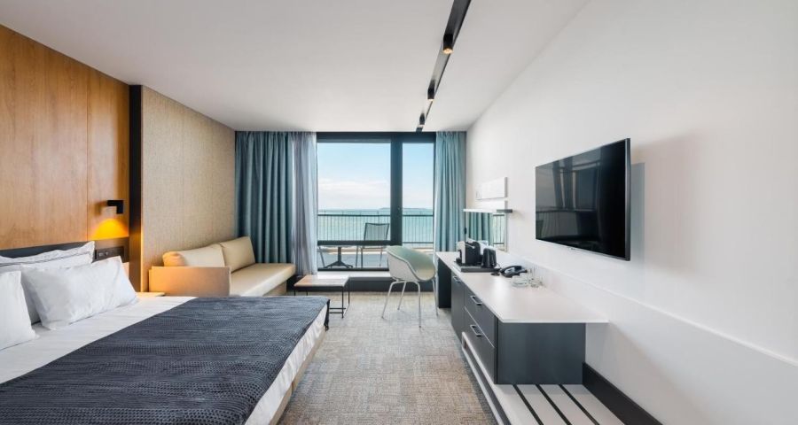 Двойна стая море (30 - 35 кв.м.) - разполага с двойно легло King Size (180х200 см.) и допълнително разтегателно легло (90х190 см.), сателитна телевизия, климатик, минибар и голям балкон. Максималното настаняване е 3 възрастни и 1 бебе.