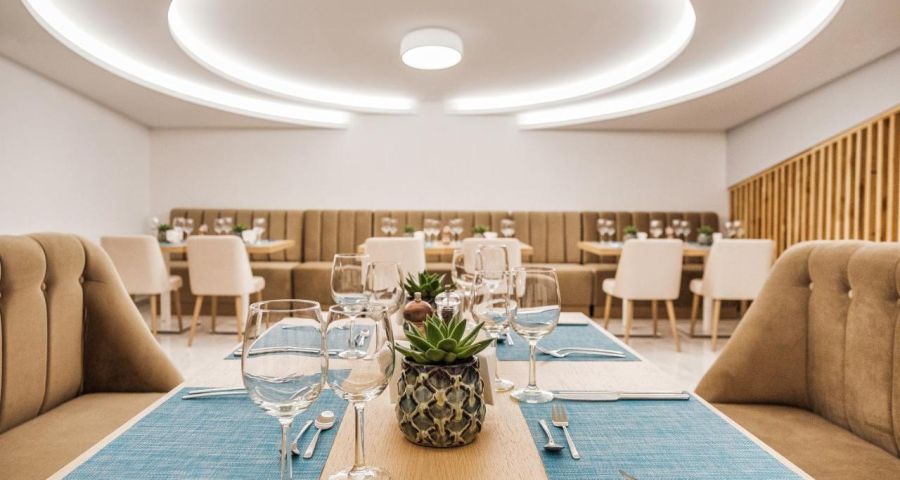 Хотелът разполага с денонощна рецепция, детски клуб, СПА център с вътрешен басейн, сауна, парна баня и фитнес, както и с мини аквапарк.