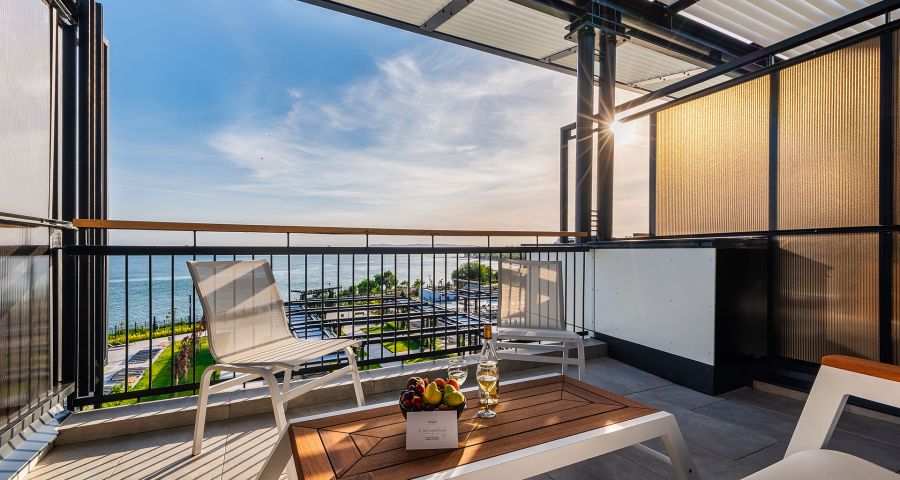 Фамилна стая море (40 кв.м.) - разполага с двойно легло King Size (180х200 см.) и две допълнителни разтегателни легла (90х190 см.), сателитна телевизия, климатик, минибар. Стаите от този тип имат по-голям балкон (14 кв.м.). Максималното настаняване е 3 възрастни и 1 дете до 12 ненавършени години.