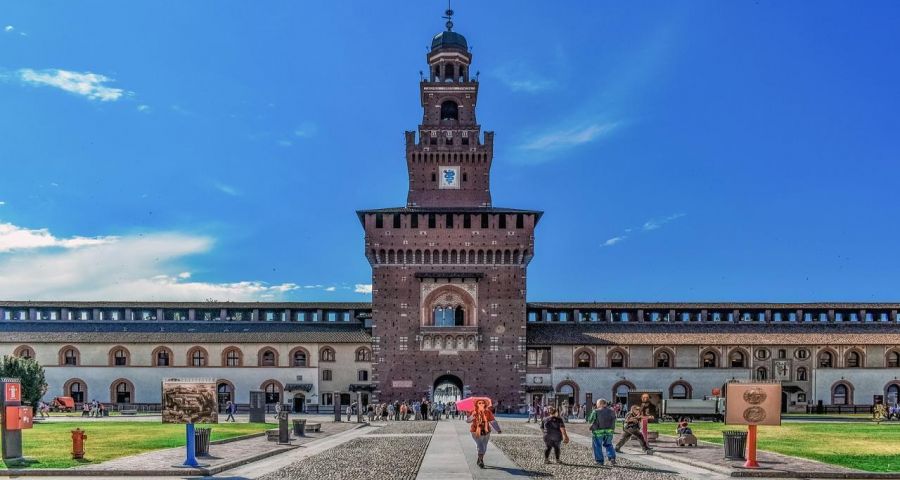 Следва замъкът Сфорцеско (отвън) - внушителна крепост, построена през 1368 г., която векове наред е била символ на могъществото на миланските херцози и днес приютява безценни произведения на изкуството.