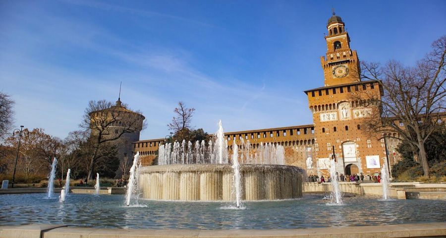 Следва замъкът Сфорцеско (отвън) - внушителна крепост, построена през 1368 г., която векове наред е била символ на могъществото на миланските херцози и днес приютява безценни произведения на изкуството.