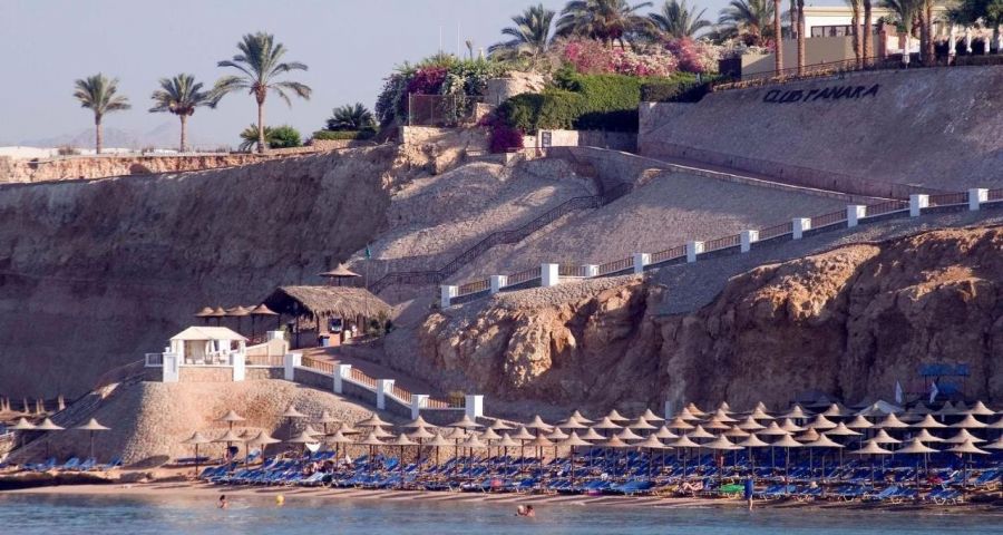 Jaz Fanara Resort 5* Най-романтичния хотел с най-красивия риф. Ползва се предимно от туристи-дайвъри. Много луксозен с богата анимация от веригата на Magic World с невероятна гледка към националния парк Рас Мохамед. В близост са култовото кафе Farsha и рибния ресторант Fares. Хотелът е с висок бряг, каскадно разположен. На територията на хотела има няколко бара-плажен, pool bar, два ресторанта-един основен и един А ла Карт с италианска кухня, детски кът,няколко басейна-два, от които (един детски и един за възрастни) отопляеми през зимата. Предлагат се стандартни, супериорни и фамилни стаи предимно с гледка градина и басейн. Безплатен WiFi само на рецепция. Плажът е малък,но рифът е на самия плаж.