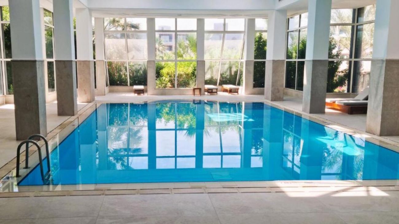 - Открит басейн с шезлонги и чадъри