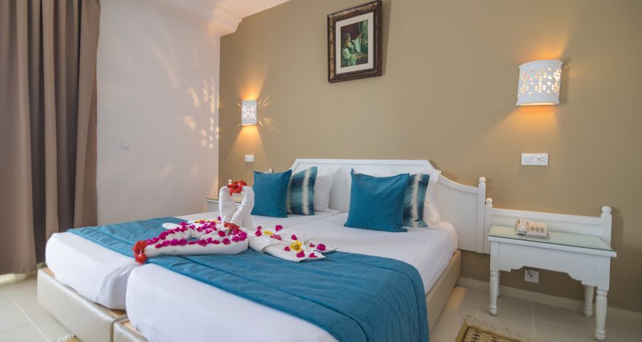 Хотелът разполага със 170 стаи разпределени в няколко двуетажни сгради без асансьор. Всяка стая ( 20 кв.м) разполага с климатик, телевизор, телефон, сейф, мини-бар (празен), Wi-fi интернет, сешоар, баня с вана или душ, балкон или тераса.