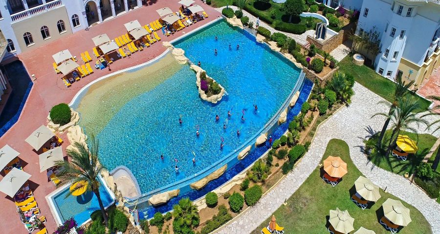 Основен ресторант Zeituna, 3 тематични а ла карт ресторанта, всеки от които може да бъде посетен безплатно веднъж по време на престой след предварителна резервация (в хотел Medina Belisaire & Thalasso със средиземноморска кухня, в хотел Medina Diar Lemdina с мароканска кухня, в хотел Medina Solaria & Thalasso с италианска кухня, лоби бар Shark Bar, бар басейн, плажен бар, мавританско кафене (срещу заплащане), 2 открити басейна, 1 закрит басейн, Таласо център, денонощна рецепция, 4 конферентни зали, обмяна на валута, анимация.