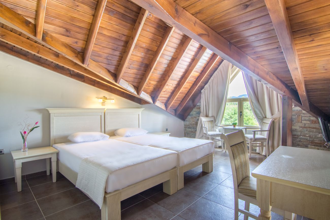 Хотел Исмарос се състои от две самостоятелни звена – централна хотелска част и вили. Хотелът предлага настаняване в модерно обзаведени помещения, разполагащи с нужния уют и комфорт, които да направи почивката Ви невероятна. В близост до централната хотелска част са изградени на четири групи по четири вили. Построени са в традиционен стил от камък и дърво с модерно обзавеждане в хармония със заобикалящата среда.На 200 м от хотела се намира пристанището на Марония, а на 20 м от него може да похапнете в типична гръцка таверна. Вечерта отваря врати и модерна дискотека на плажа до пристанището.