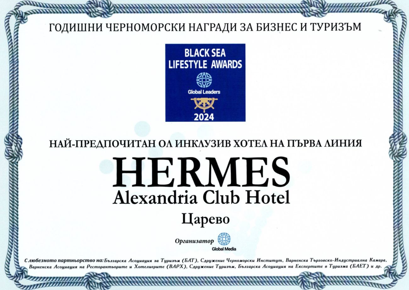 Hermes Alexandria Club Hotel Царево бе отличен на форума „Черноморски награди за бизнес и туризъм“ с награда Най-предпочитан Ол Инклузив хотел на първа линия .