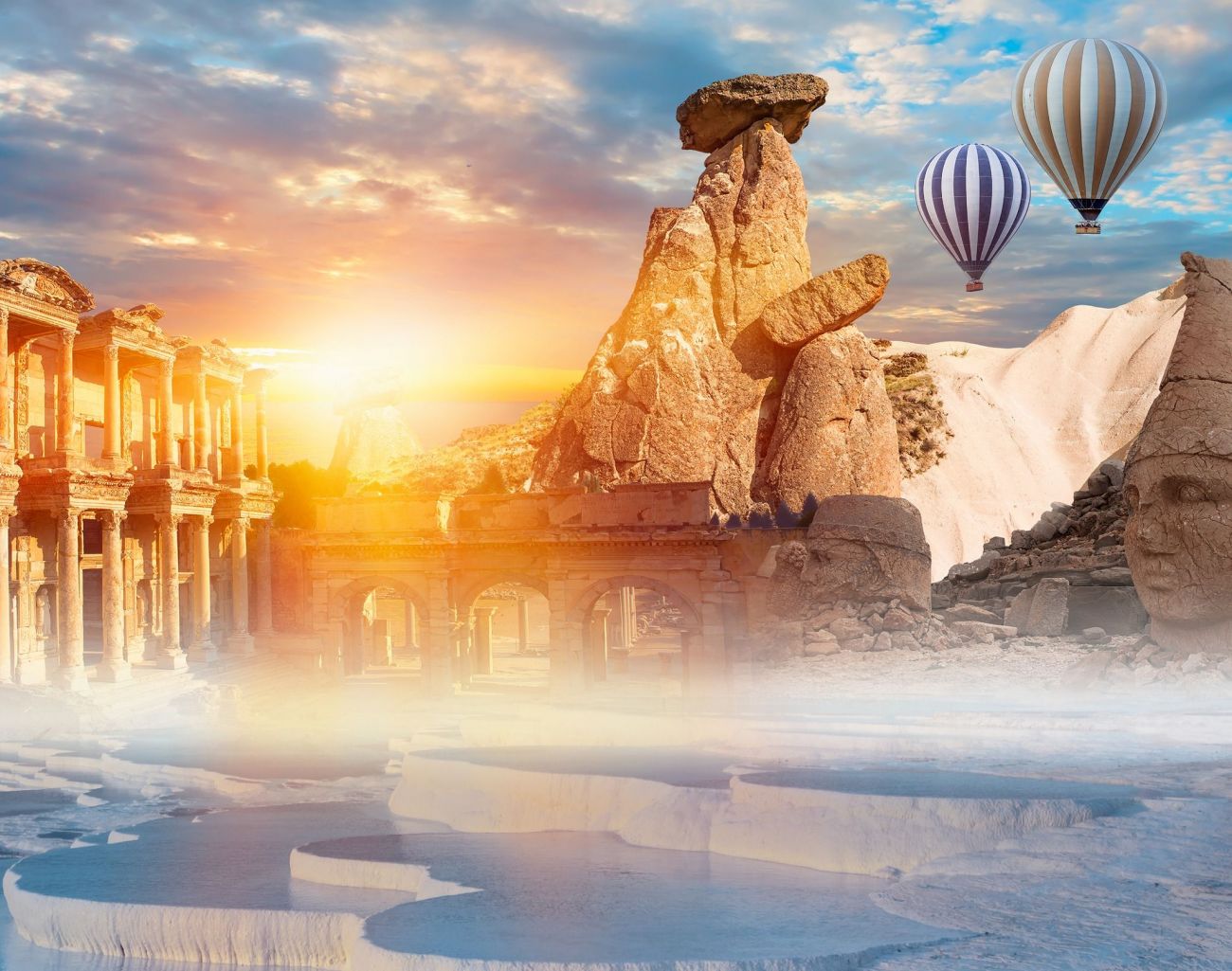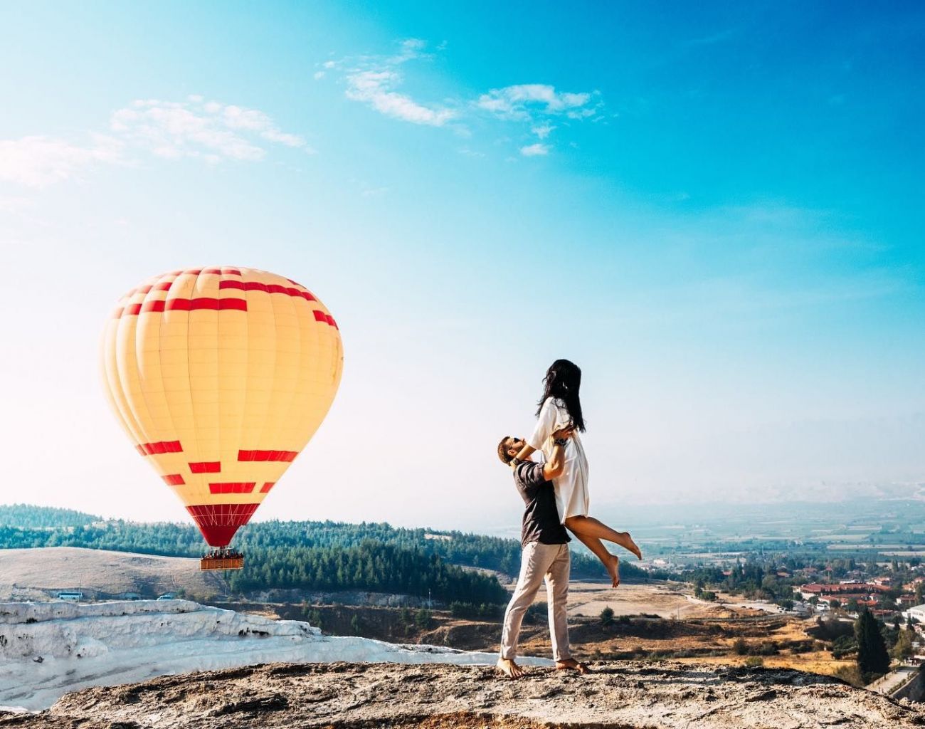 Полет с балон с горещ въздух над снежно белите варовикови травертини на Памуккале,