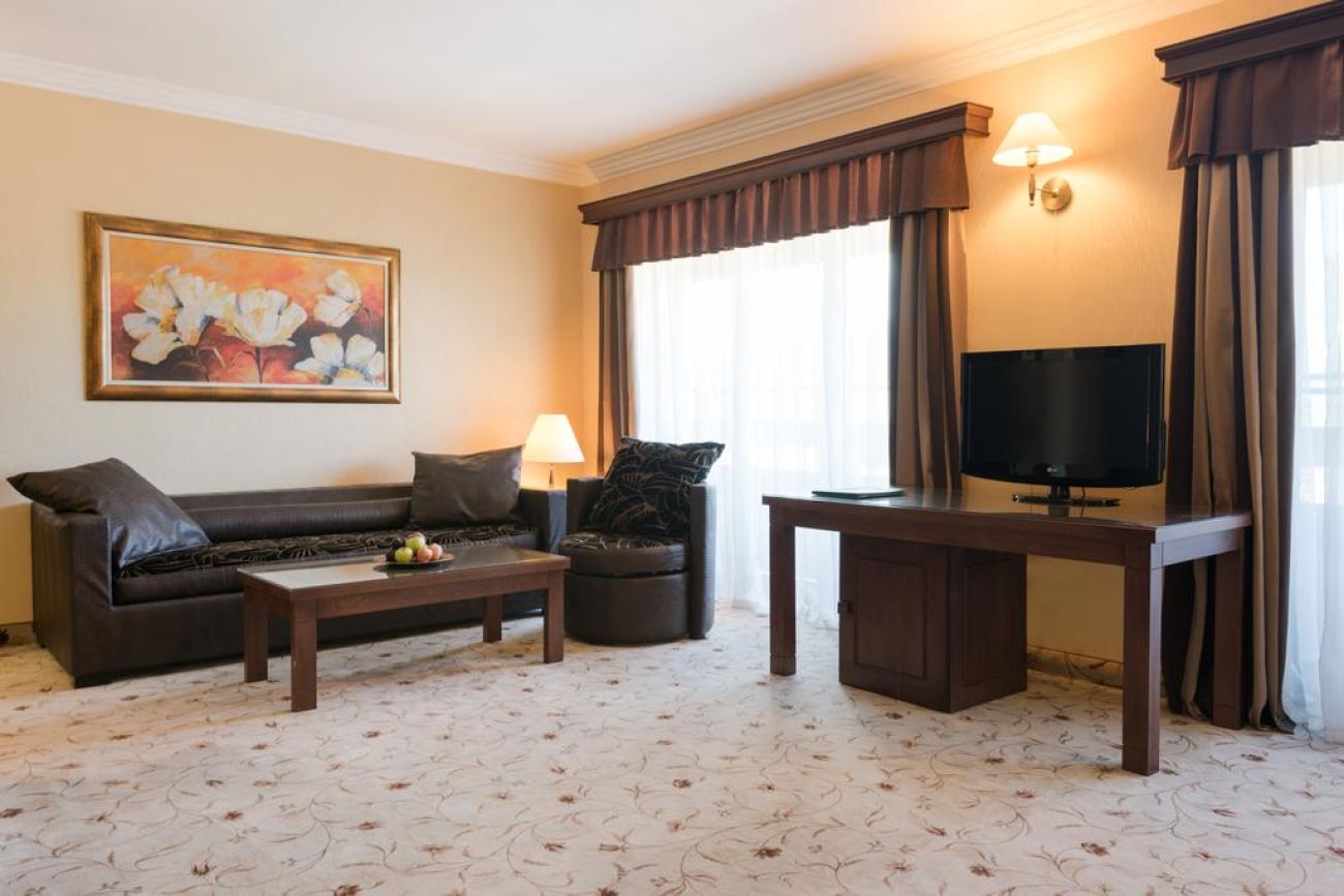 Мини-бар с алкохолни и безалкохолни напитки, голяма баня с душ-кабина и вана, халати и хавлиени кърпи, климатична система с индивидуално регулиране, сейф, кабелна телевизия, безжичен интернет