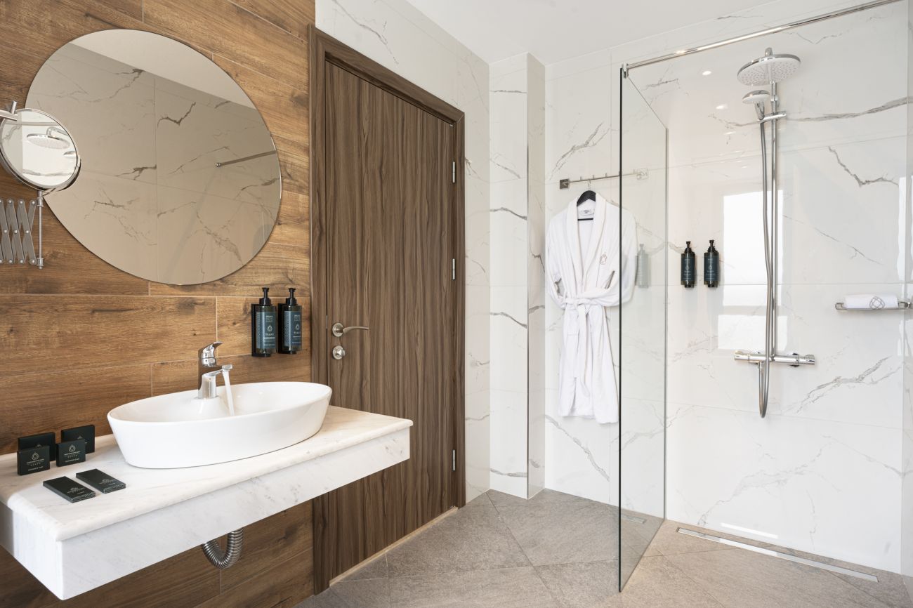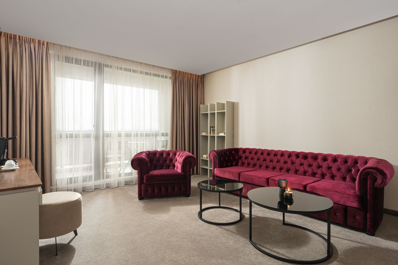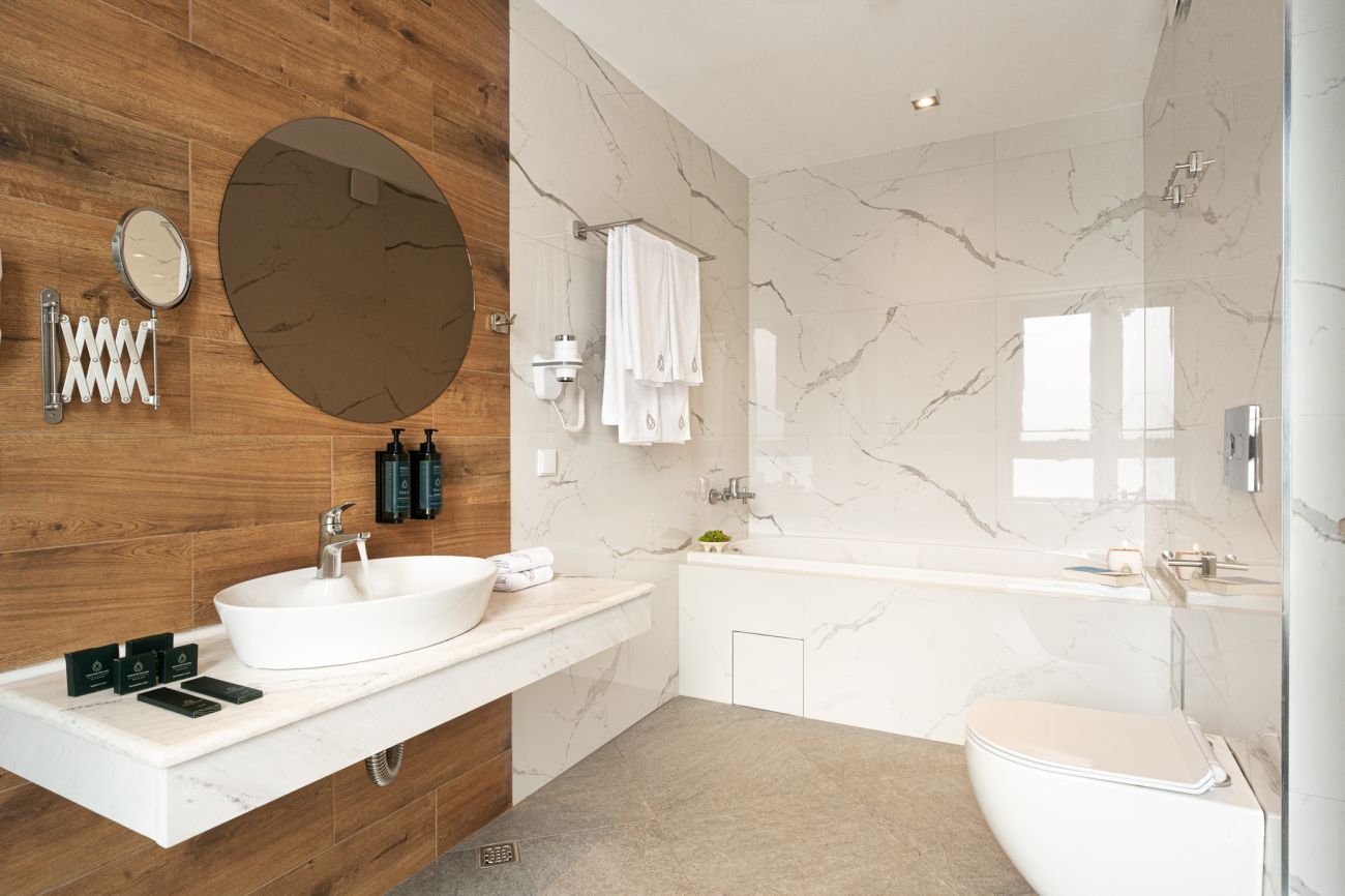 Най-просторното помещение в комплекса e олицетворение на изисканост и лукс. Разполага с две отделни спални, две бани (едната с вана) и обособена холова част. Просторната му тераса гледа към красивия парк на Павел баня. Напълно подходящ за хора търсещи мащаб или две приятелски семейства.