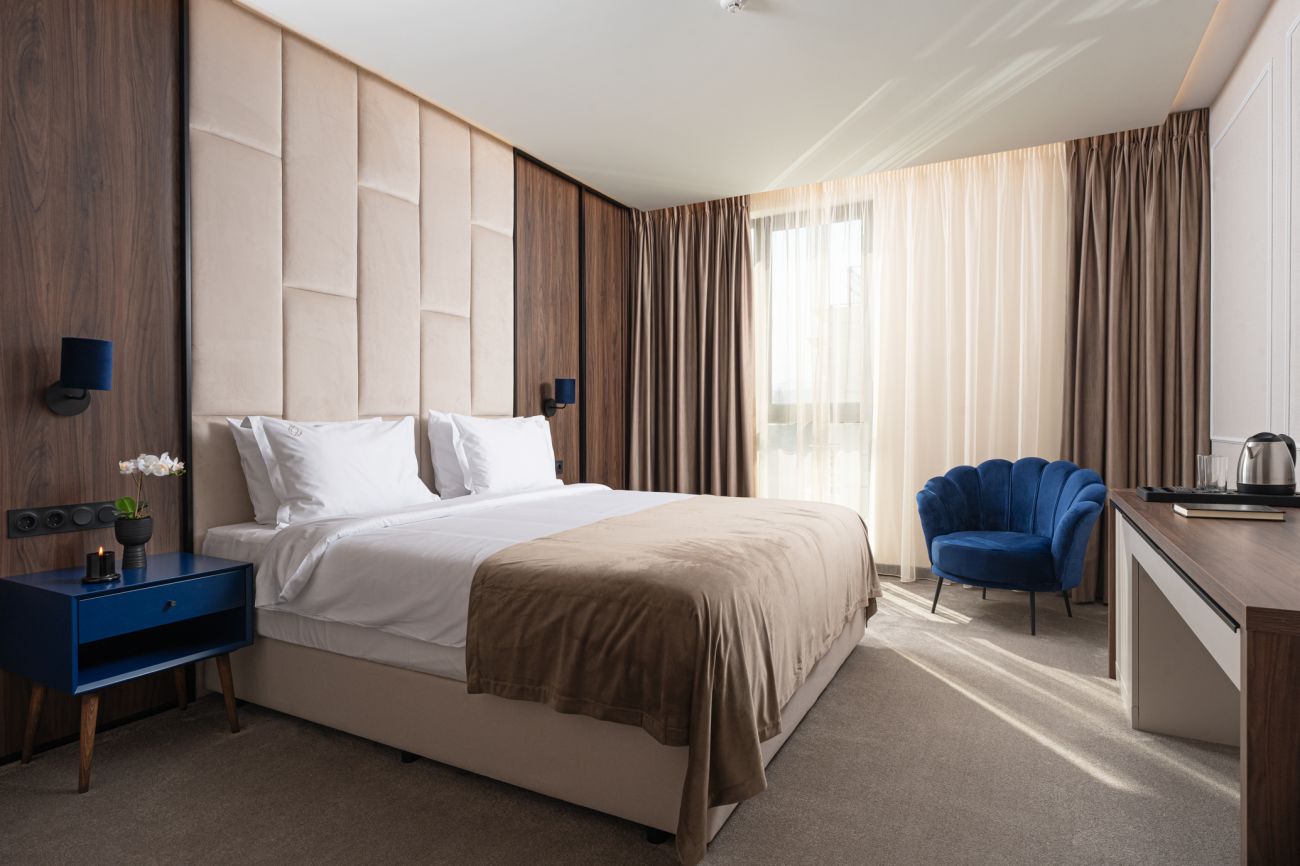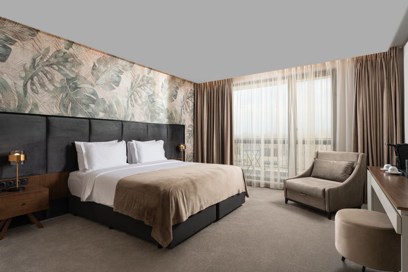 Стандартните стаи са с площ около 24-26 кв.м. и разполагат със спалня (180/200), разтегателен фотьойл, баня с душ кабина, телевизор, хладилник, кана за вода, балкон и др. Комфорт, елегантност и функционалност с усещане за спокойствие. Идеална е за вашия пълноценен престой.