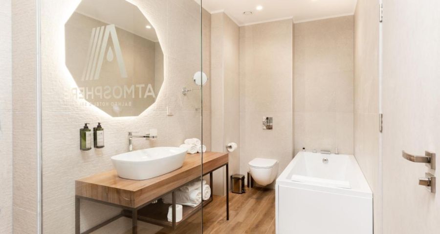 Климатизираните стаи в хотела разполагат с гардероб, кафемашина, минибар, сейф, телевизор с плосък екран и собствена баня с душ. Стаите разполагат с електрическа кана, а някои имат балкон, а други са с изглед към града. Стаите в Atmosphere Balneo Hotel & SPA разполагат със спално бельо и кърпи.