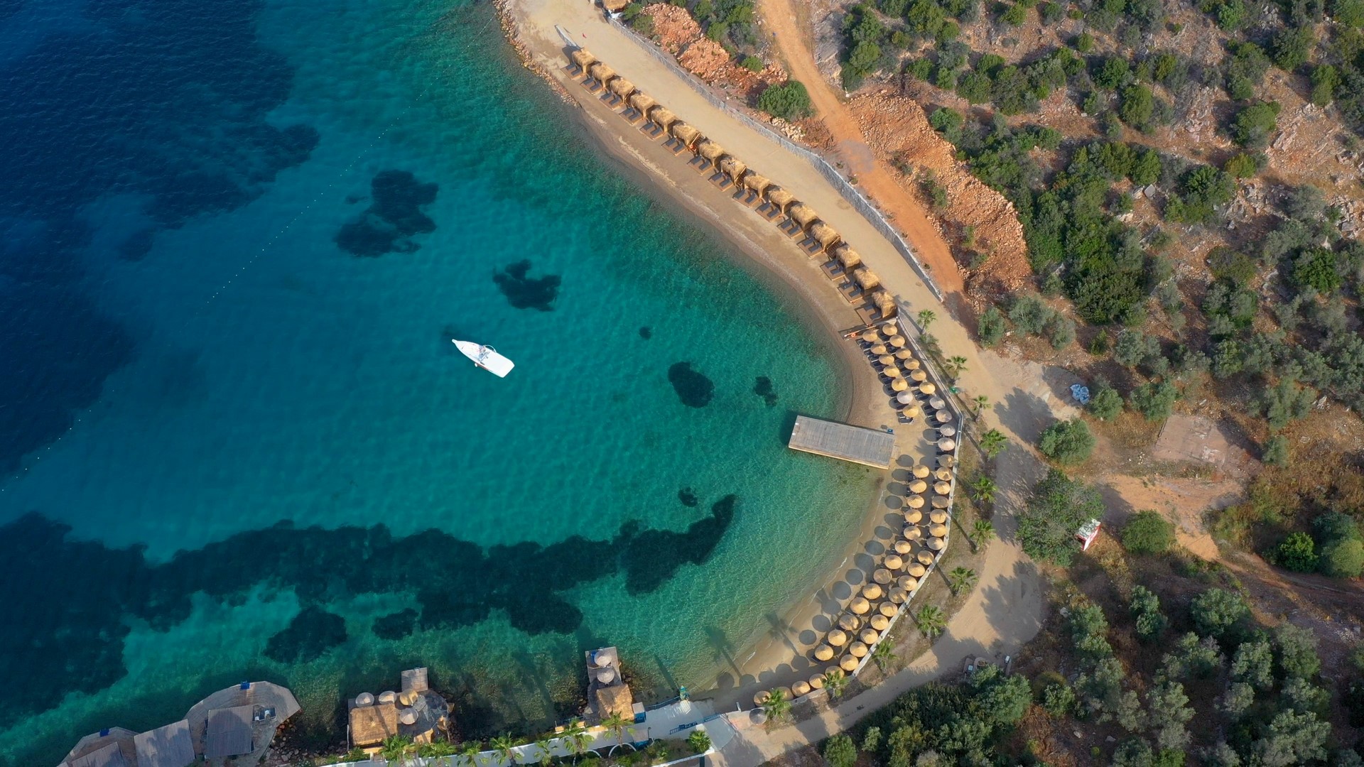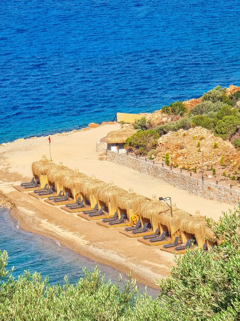 Собствен, пясъчно - чакълест и платформа - чадъри, шезлонги, плажни кърпи и матраци на плажа и при басейна - безплатно.