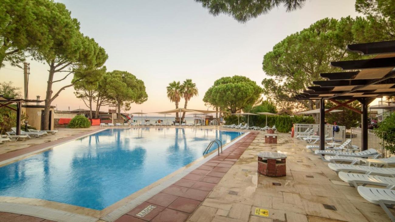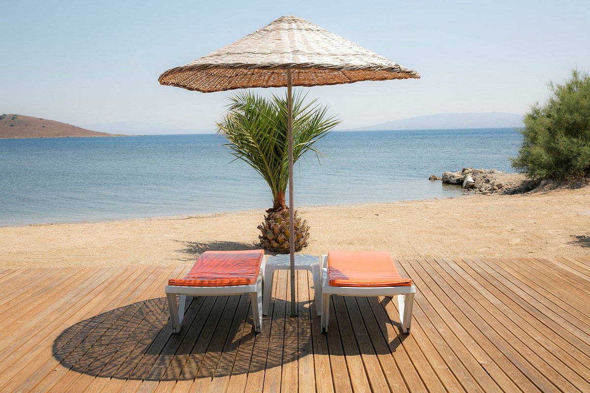Собствен, пясъчно - чакълест. Чадъри, шезлонги на плажа и при басейна – безплатно.