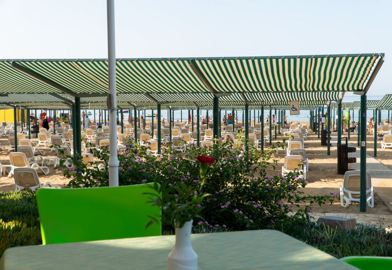 Собствен пясъчен плаж. Шезлонги, чадъри, плажни кърпи - безплатно.