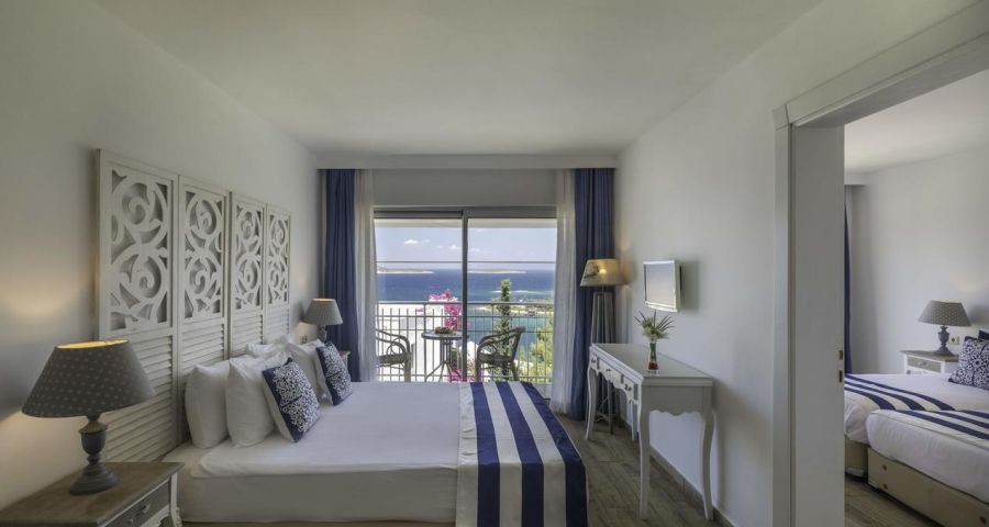Хотелът се състои от 341 стаи: 217 клубни стаи (от които 81 с гледка градина и 136 гледка море), 58 клубни семейни стаи с гледка градина, 28 делукс семейни стаи и 38 делукс стаи. Всички стаи са оборудвани с: баня с душ, сешоар, климатик, телевизор, телефон, сет за кафе и чай (безплатен), минибар (безплатен, зарежда се веднъж при пристигане с безалкохолни напитки и вода, през останалите дни - веднъж на ден вода и газирана вода), сейф (платено), смяна на спалното бельо – 3 пъти седмично.