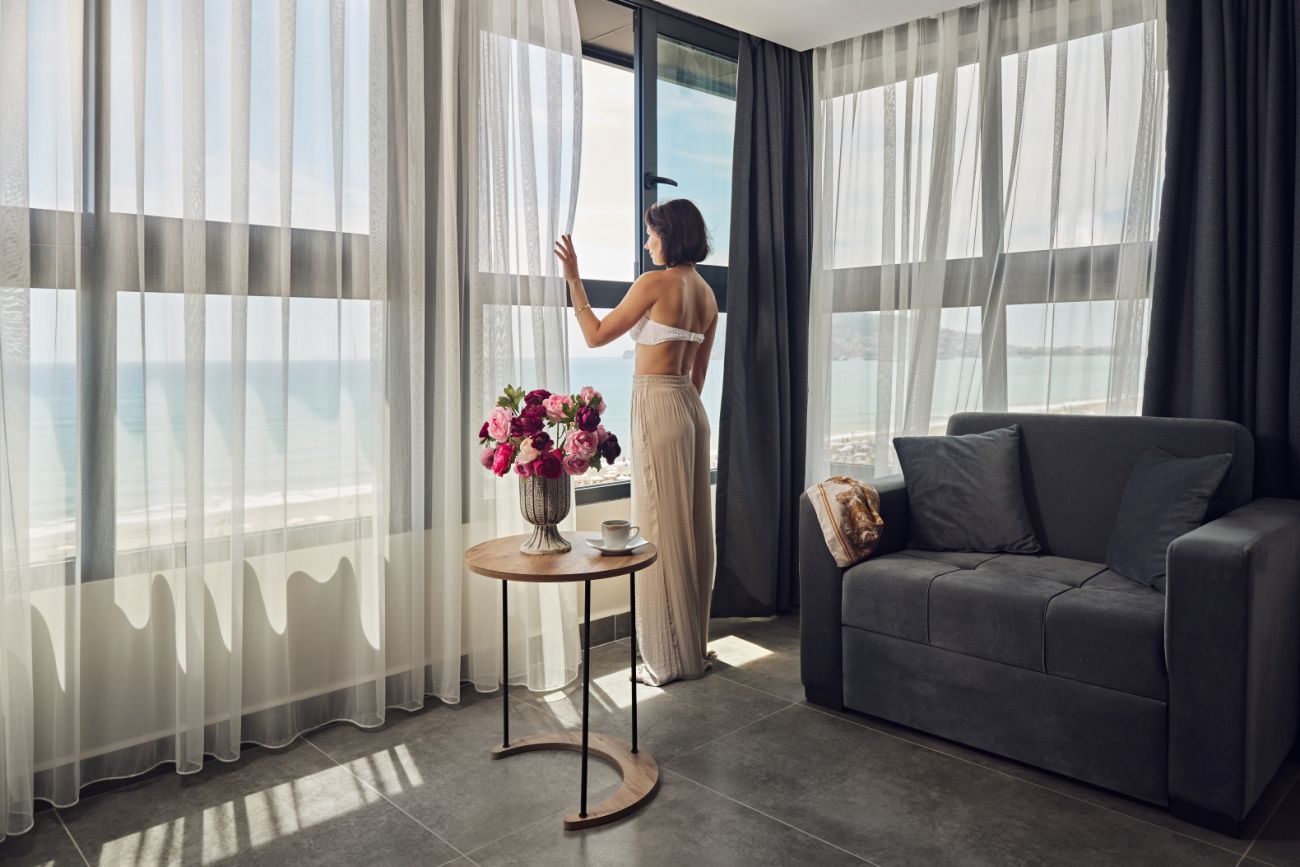 Хотелът разполага с общо 214 стаи, разположени в 3 шестетажни корпуси, от които 185 Standard room (18-25 м2), 2 Handicapped room 25 m², 28 Family room (2 спални, 1 баня – 55 м2). Всички стаи са оборудвани с климатик, телевизор, телефон, баня с душ/вана, сешоар, минибар (срещу заплащане), сейф (срещу заплащане). Почистване на стаите всеки ден - смяна на спалното бельо и кърпите - 2 пъти в седмицата.