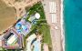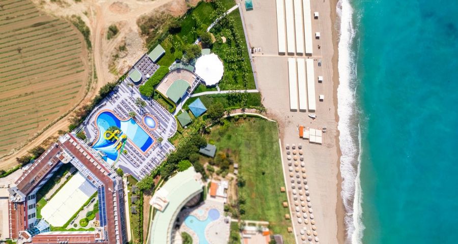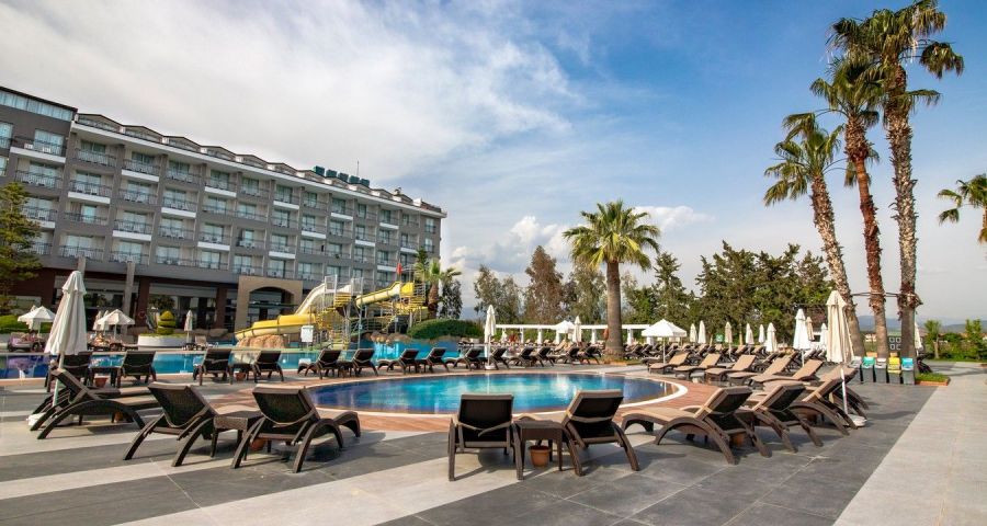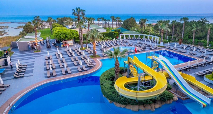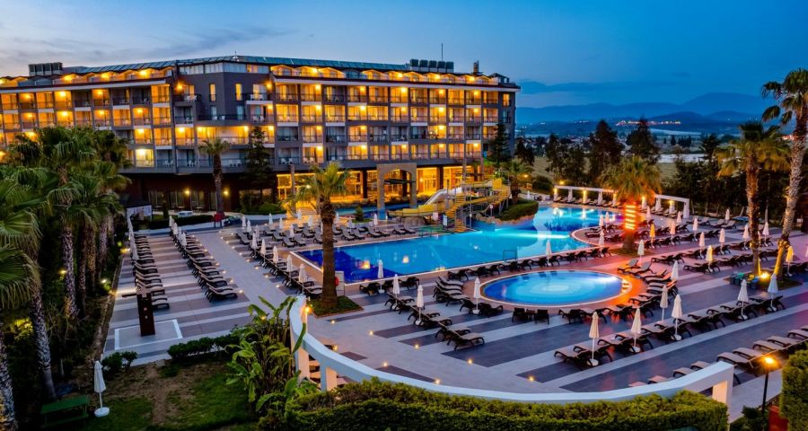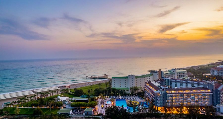на 70 километра от летище Анталия, на 80 километра от центъра на Анталия, заема първа линия на плажа
