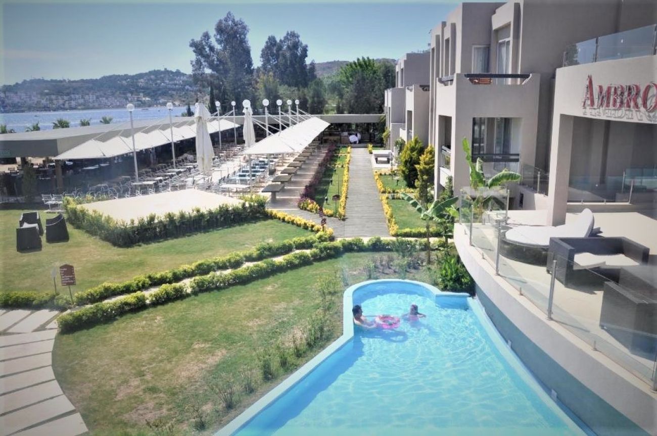 Хотел Амброзия има уникална, грабваща окото и модерна архитектура. Намира се на 7 км от центъра на Бодрум и на 4 км от международното летище Бодрум Милас.
