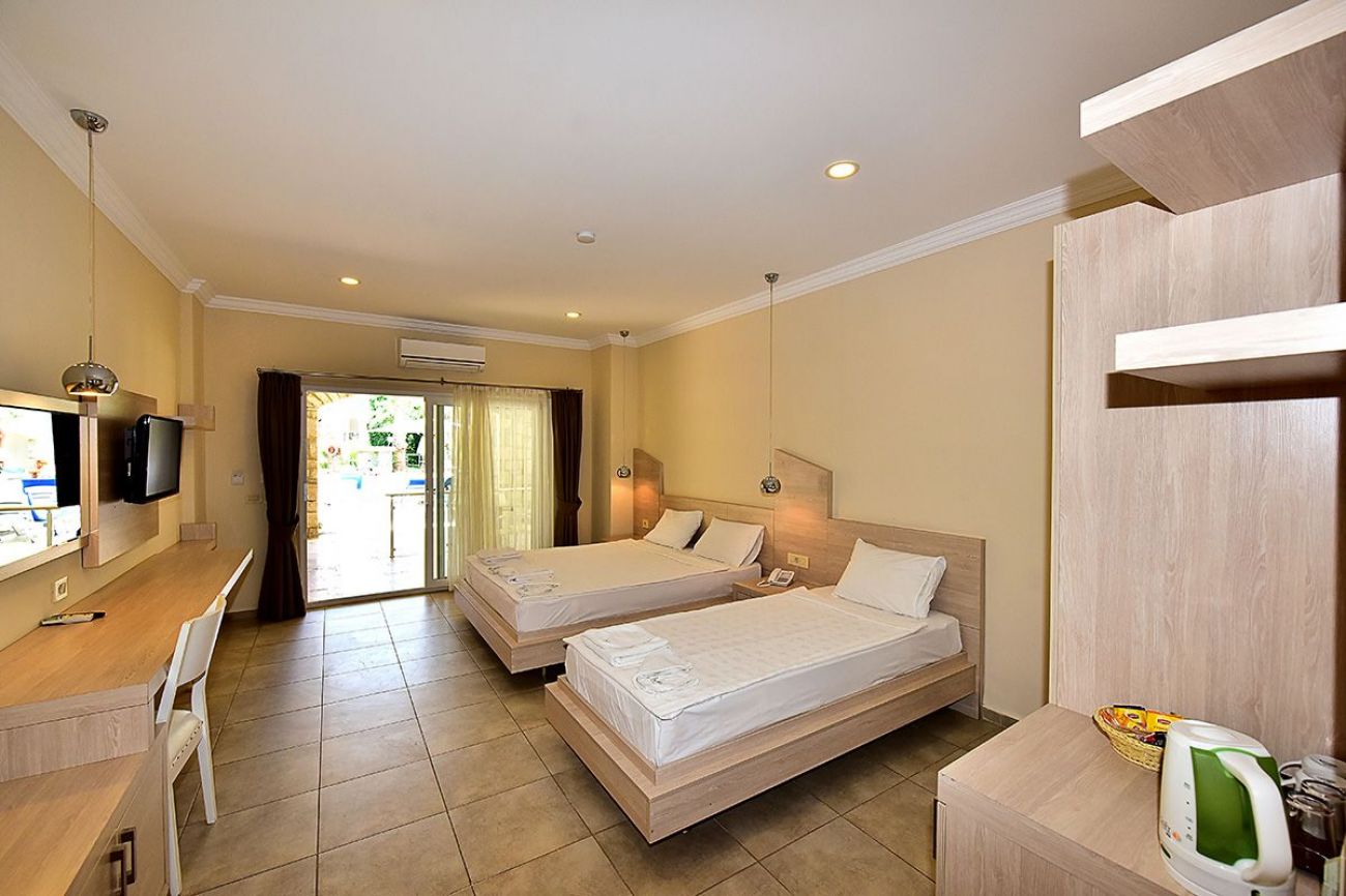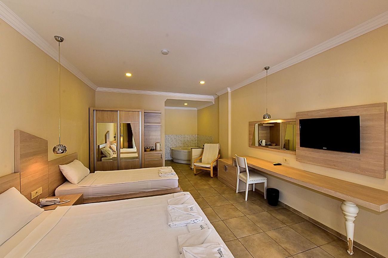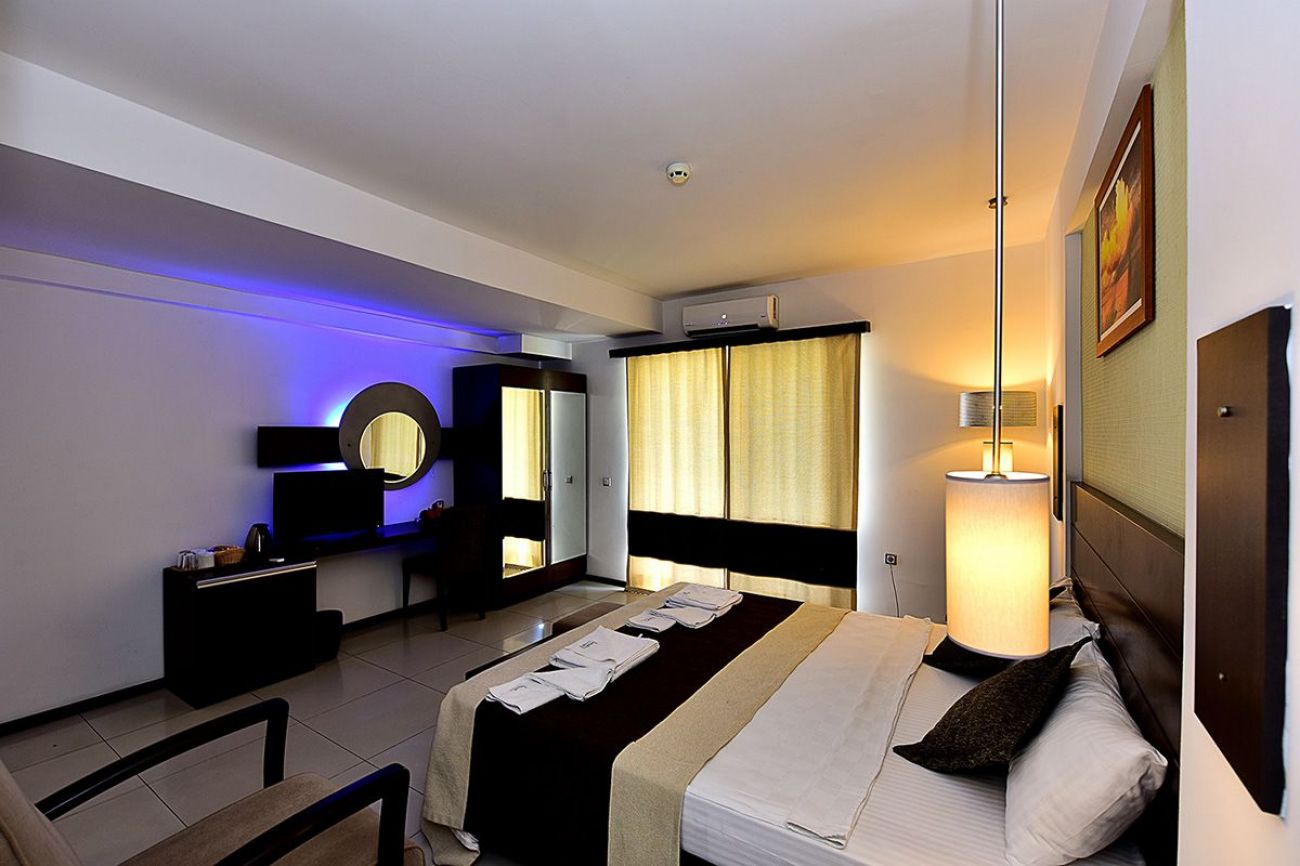 204 стандартни стаи(18кв.м.), 8 фамилни(30 кв.м.) и 25 апартамента(40 кв.м.). Открит ресторант, a la carte ресторант (срещу заплащане), бар на плажа и на басеина.