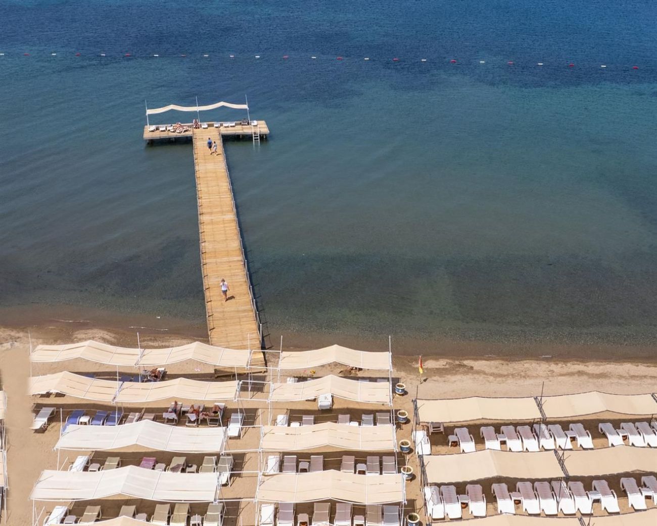 собствен, пясъчен. Чадъри и шезлонги, при басейна и плажа - безплатно.
