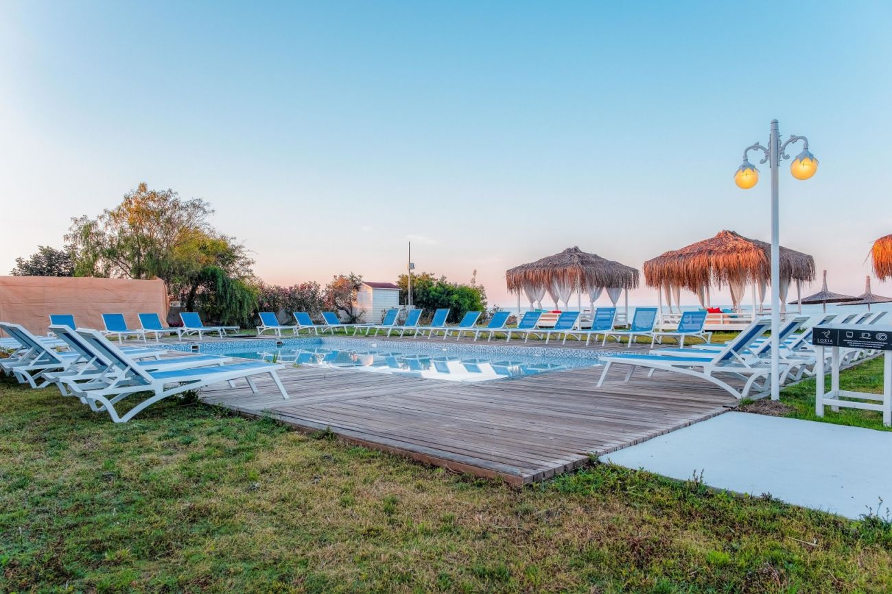 Собствен чакълест плаж. Чадъри, шезлонги и плажни кърпи на плажа и басейните - безплатно.
