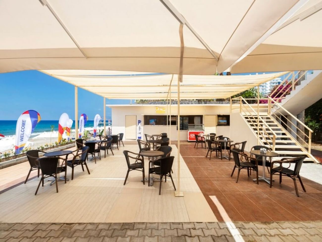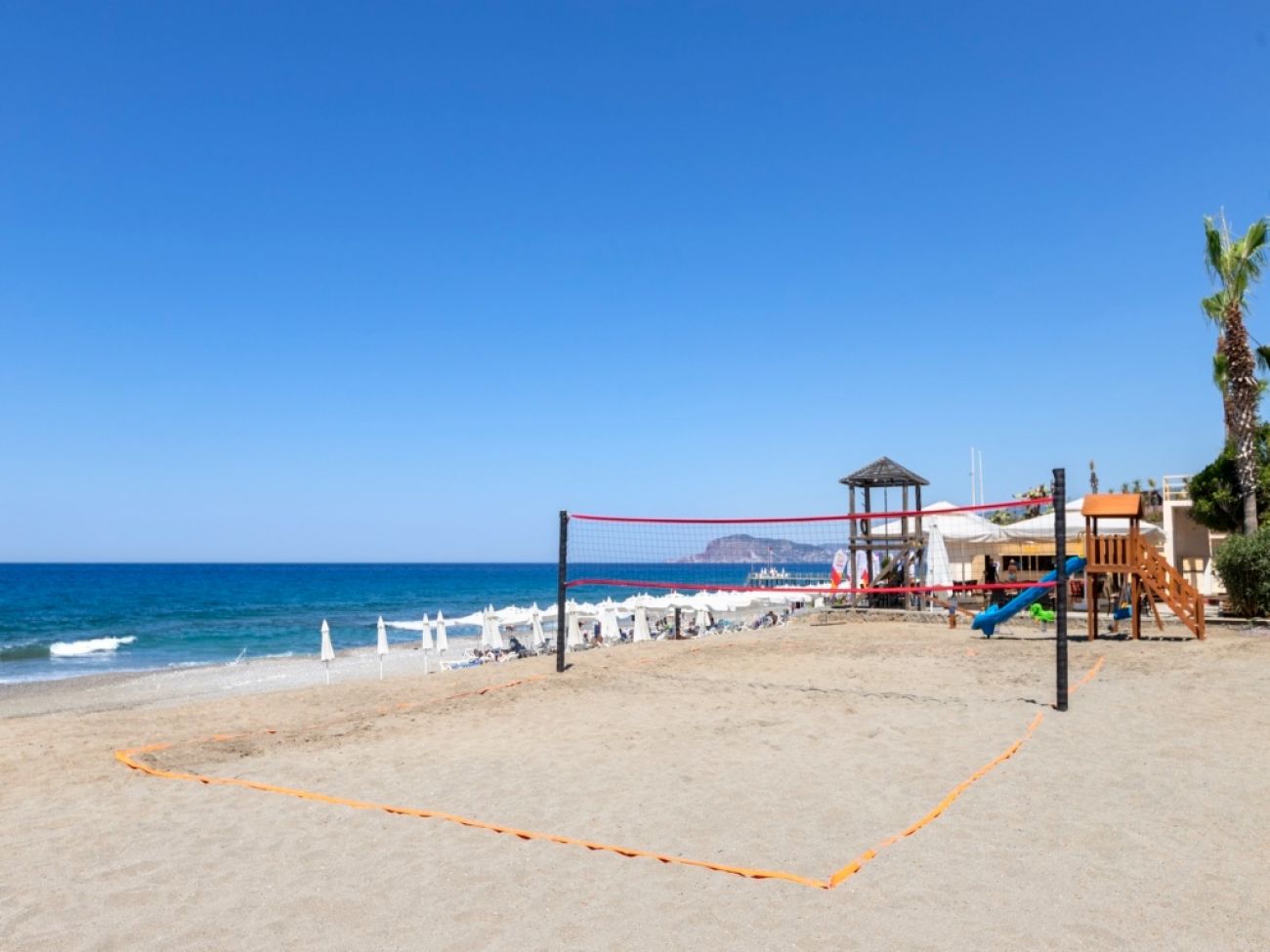 Собствен, пясъчно-чакълест с дължина 150 м. (до плажа се стига през подлез). Чадъри и шезлонги на плажа и при басейна – безплатно. Плажни кърпи – безплатно.