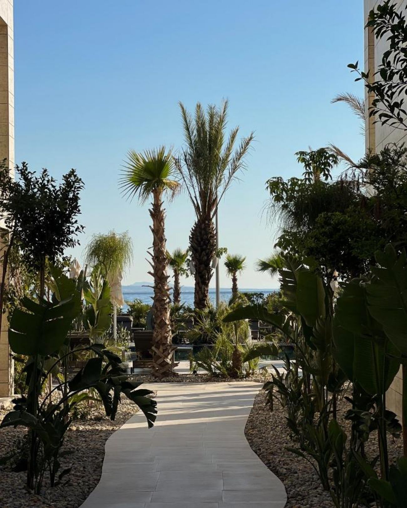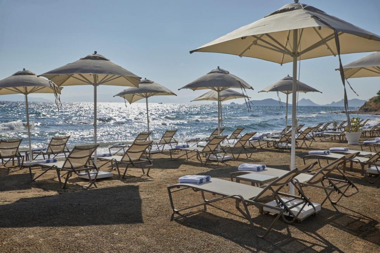 Собствен, пясъчно - чакълест. Чадъри, шезлонги и плажни кърпи на плажа и при басейна – безплатно.