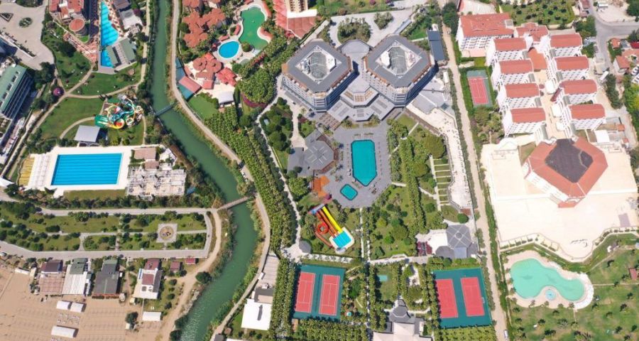 а, волейбол, зала за игри, тенис на маса, дартс, сауна, масажи, турска баня, детски клуб, различни магазини, тенис на корт, 1 басейн за възрастни и 1 за деца