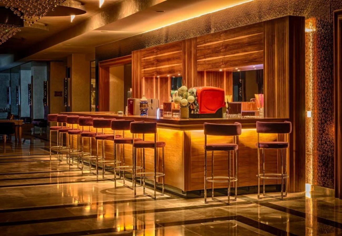 Основен ресторант, а-ла-карт ресторант (с предварителна резервация), 3 бара, открит и закрит басейн, водни пързалки, магазини, СПА център, паркинг.