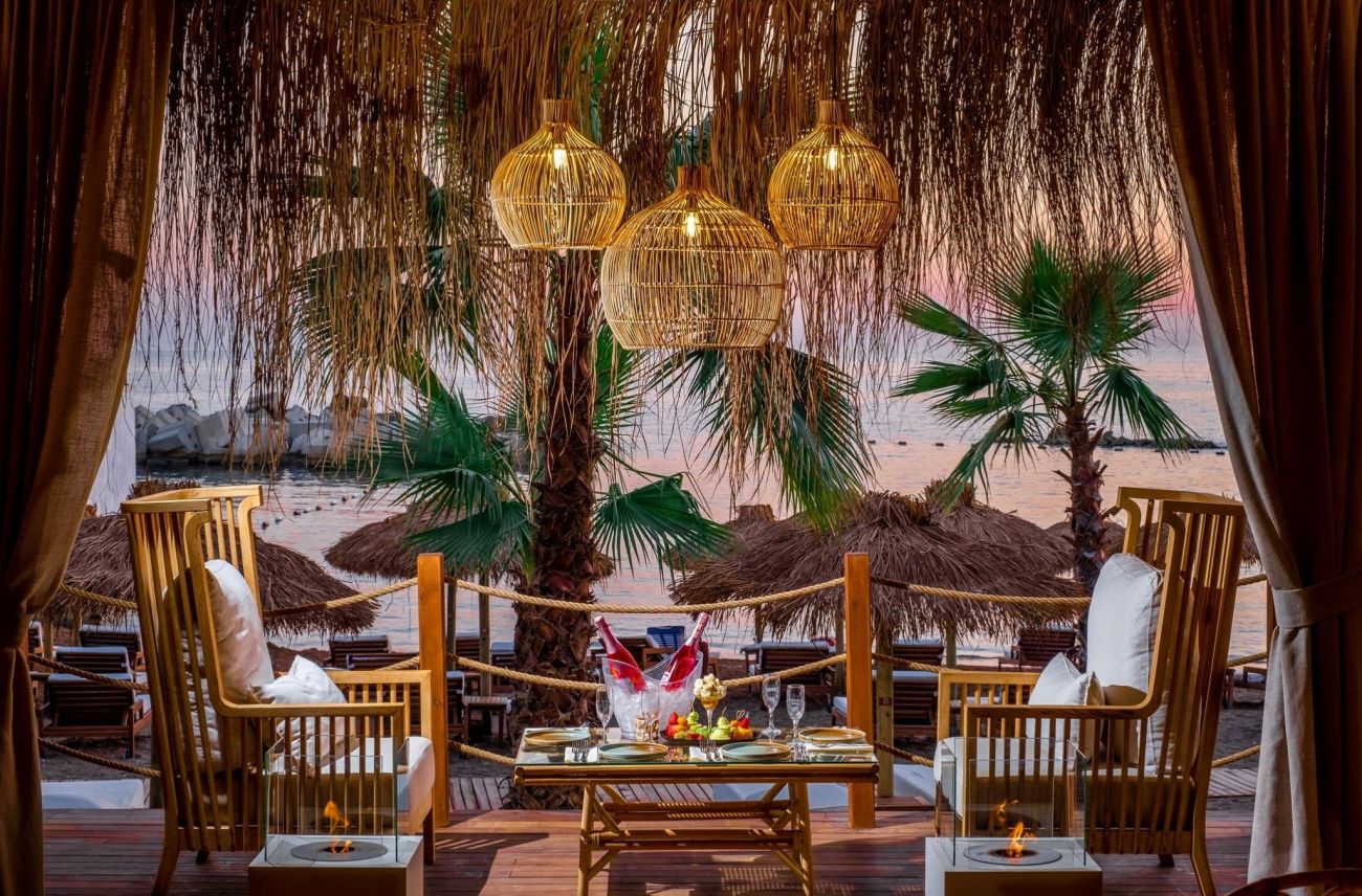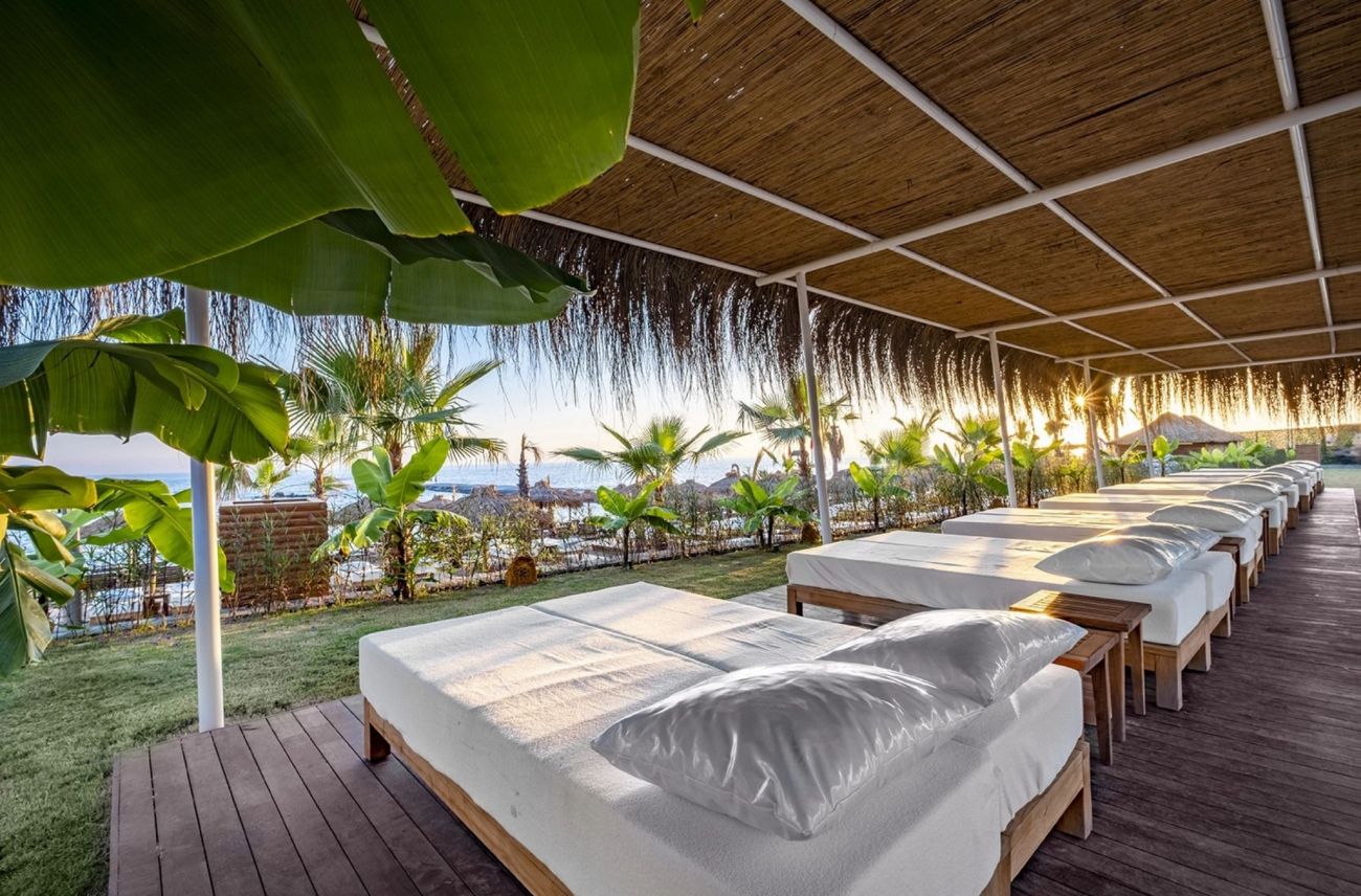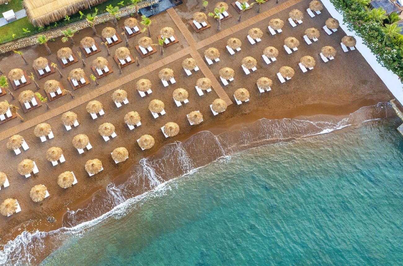 Собствен, пясъчен, притежава сертификат "Син флаг", платформа. Чадъри, шезлонги, матраци и плажни кърпи на плажа и при басейна - безплатно.