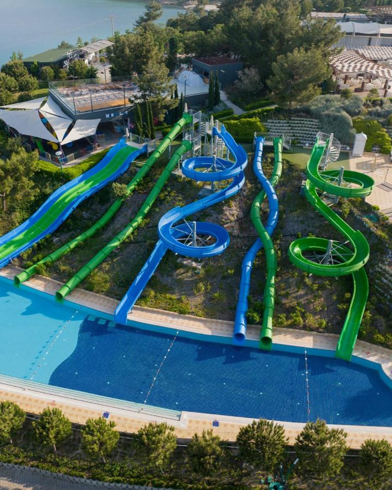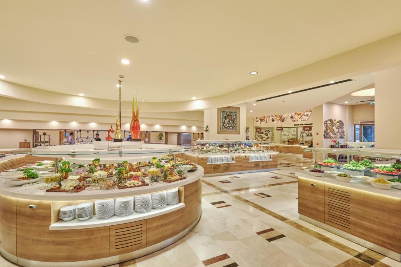 Основен ресторант PINA с диетичен, вегетариански и детски кът; 5 а-ла-карт ресторанта (турски MARDIN, италиански PULCINELLA, тепаняки SAKURA - с предварителна резервация, 4 снек ресторанта; 12 бара, сладкарница, 2 открити басейна, 1 закрит басейн, аква парк с 10 водни пързалки, амфитеатър, СПА център, дискотека, магазини, 9 конферентни зали, паркинг. На плажа има общо 16 кабани, които могат да се наемат срещу допълнително заплащане, с включен сервиз.