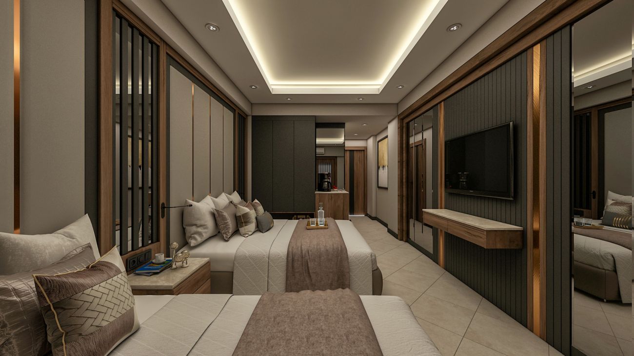 Хотелът разполага с 338 стаи, разпределени в 2 блока - 94 стандартни стаи с изглед градина (20 кв.м.), 95 стандартни стаи с изглед море (25 кв.м.), 20 фамилни стаи с изглед море (две свързани стаи, 35 кв.м.), 3 стаи за инвалиди (25 кв.м.) и промо стаи (без тераси), 37 стандартни стаи (25 кв.м.),11 лукс стаи с директен достъп до басейна (две свързани стаи, 40 кв.м.), 16 дуплекс лукс фамилни стаи (две свързани стаи, 39 кв.м.), 57 лукс фамилни стаи (две свързани стаи, 42 кв.м.), и 3 делукс суита (две свързани стаи, голяма тераса с джакузи, 61 кв.м.). Всички стаи са оборудвани с климатик, телевизор, телефон, баня с душ, сешоар, сет за чай/кафе, мини бар (платен), сейф (платен), балкон. Почистване на стаите - всеки ден, смяна на спалното бельо - 3 пъти седмично, смяна на кърпите - 3 пъти седмично.