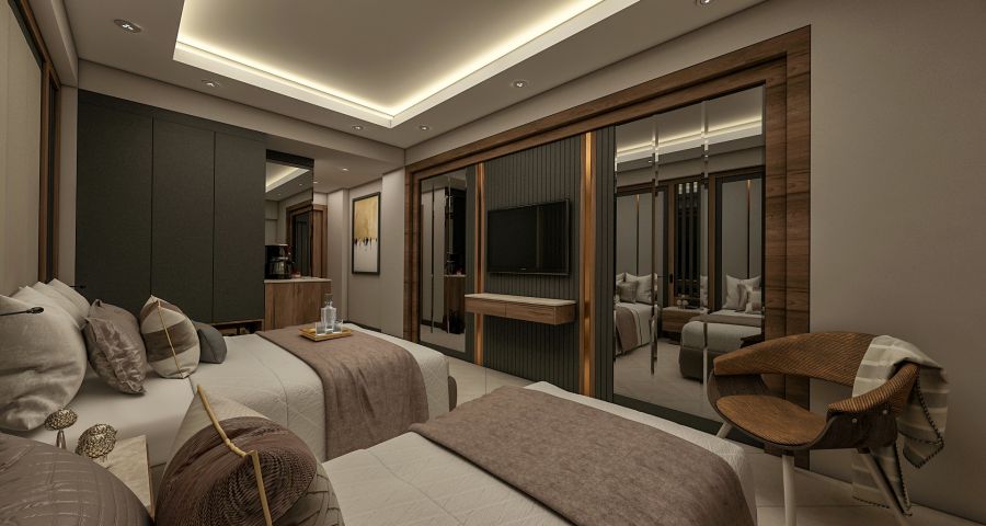 Хотелът разполага с 338 стаи, разпределени в 2 блока. В основната сграда са разположени - 91 стандартни стаи с изглед градина (20 кв.м.), 100 стандартни стаи с изглед море (25 кв.м.), 25 стандартни фамилни стаи (две свързани стаи, 35 кв.м.), 3 стаи за инвалиди (25 кв.м.) и промо стаи (без тераси), в новата сграда са разположени: 11 стаи с директен достъп до басейна (две свързани стаи, 40 кв.м.), 37 делукс стаи (25 кв.м.), 16 дуплекс фамилни стаи (две свързани стаи, 39 кв.м.), 57 селект фамилни стаи (две свързани стаи, 42 кв.м.), и 3 делукс суита (две свързани стаи, голяма тераса с джакузи, 61 кв.м.). Всички стаи са оборудвани с климатик, телевизор, телефон, баня с душ, сешоар, сет за чай/кафе, мини бар (платен), сейф (платен), балкон. Почистване на стаите - всеки ден, смяна на спалното бельо - 3 пъти седмично, смяна на кърпите - 3 пъти седмично.
