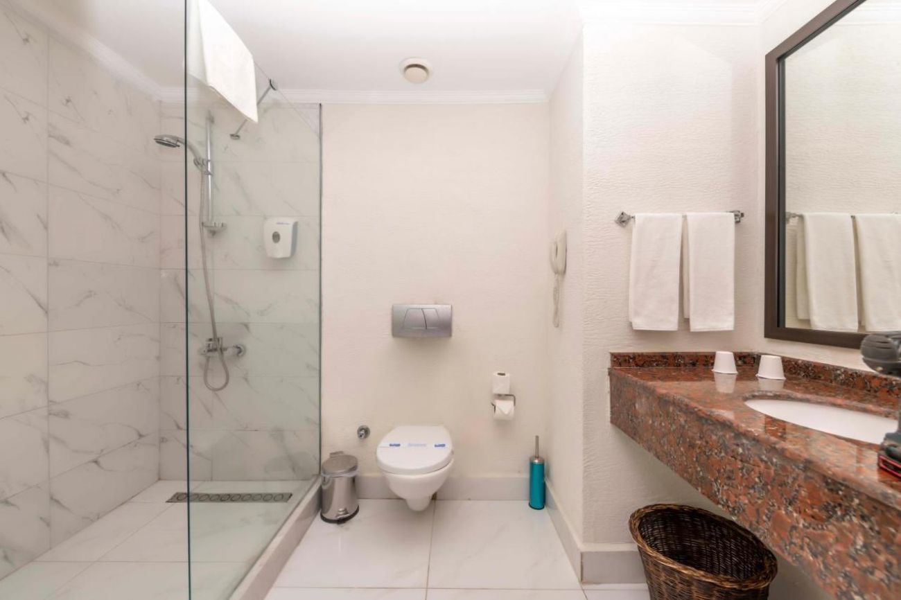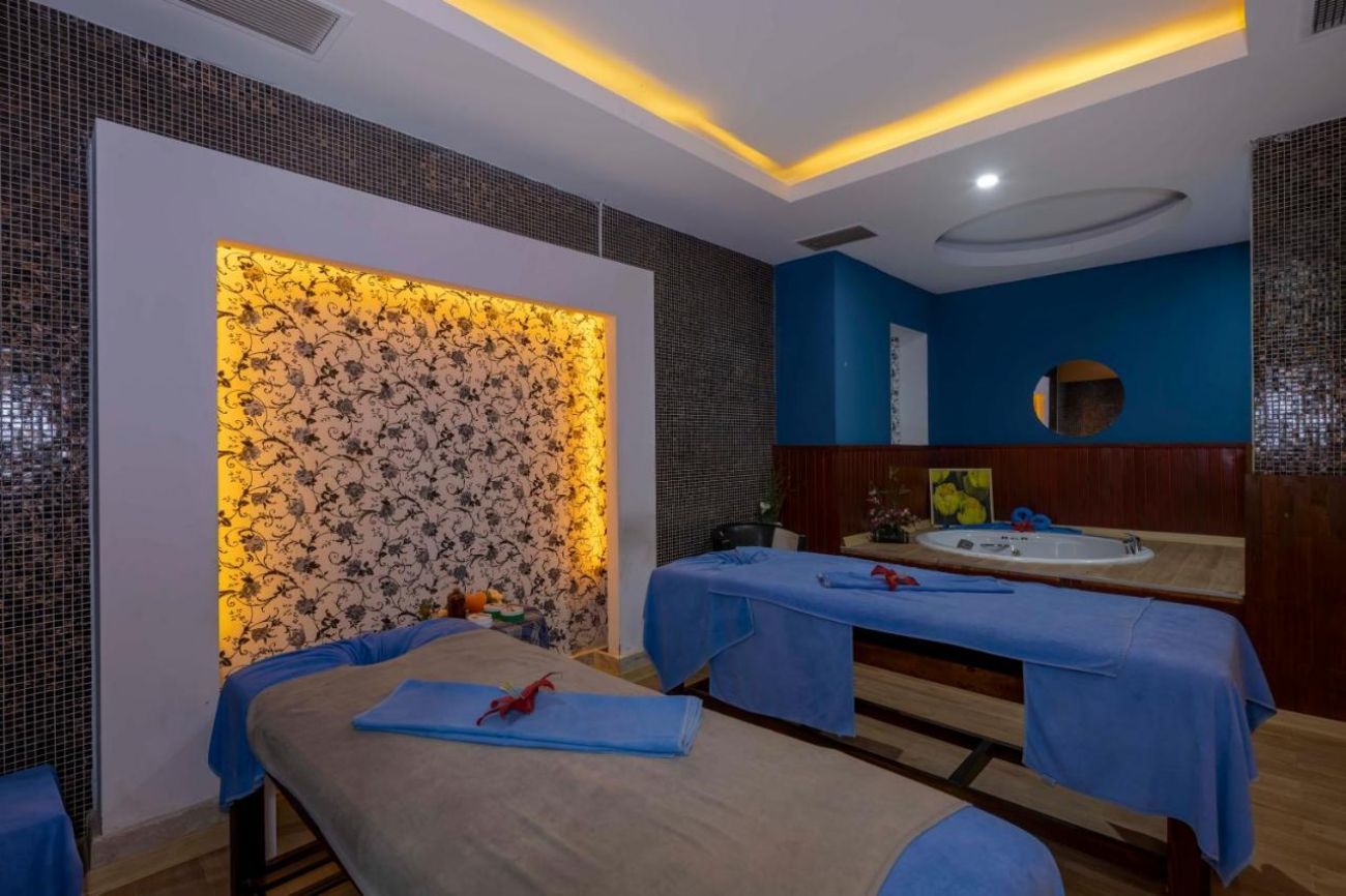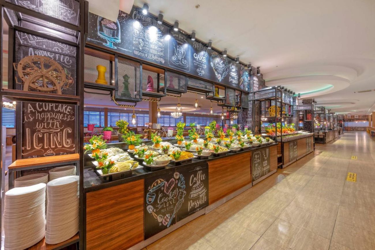 Основен ресторант, а-ла-карт ресторант (рибен - с предварителна резервация), 5 бара, сладкарница, открит и закрит басейн, водни пързалки, дискотека, амфитеатър, конферентни зали. За децата: Детски басейн с пързалки, анимация, мини клуб (4-12 г.), мини диско. Безплатни услуги: Сауна, турска баня, парна баня, фитнес, волейбол, анимация, паркинг. Платени услуги: Масаж, Спа център, фризьор, лекар, химическо чистене, билярд, рент -а-кар, тенис корт, тенис екипировка, осветление за тенис корт, магазини, водни спортове, WiFi интернет.