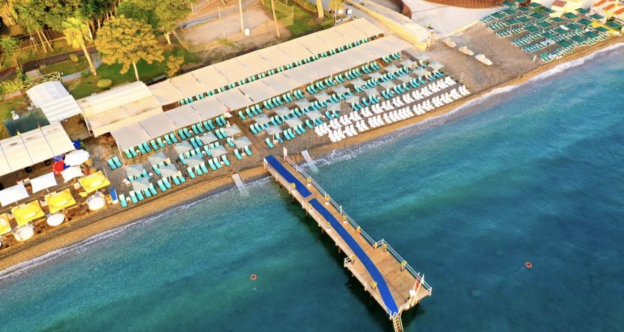 Собствен, чакълест плаж. Чадъри, шезлонги и матраци на плажа и при басейна – безплатно, плажни кърпи – срещу депозит.