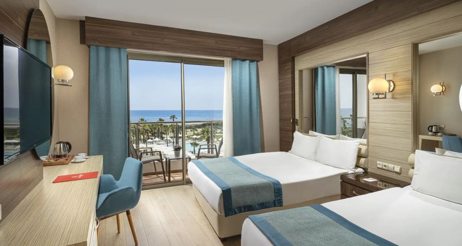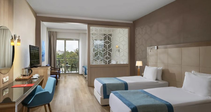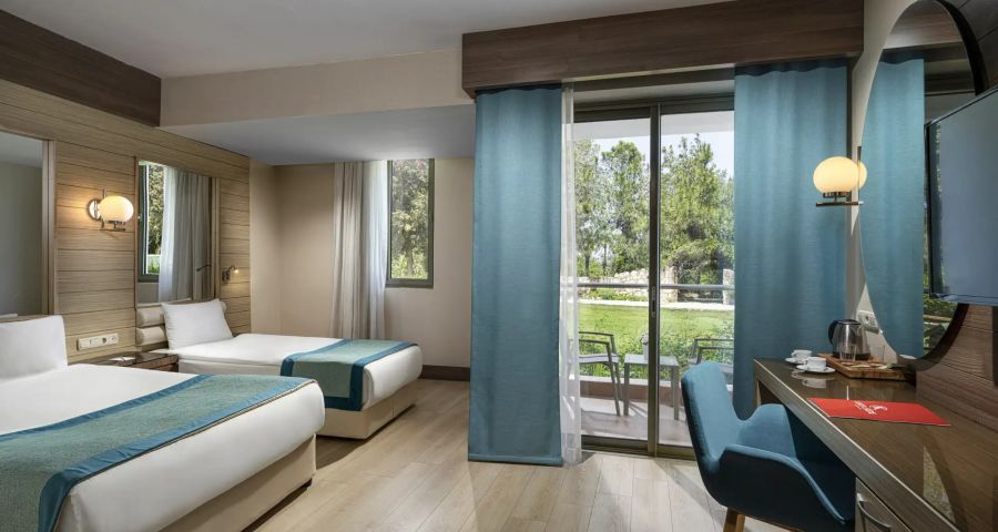 Standard room Land view (изглед суша - 25 м2), Standard room Sea view (изглед море - 25 м2), Superior room Pool view (изглед басейн - 40 м2), Superior room Lake and Garden view (изглед градина - 40 м2), Superior Garden room Terrace (с частна тераса към градината - 40 м2), Family Suite room (2 спални, 1 баня - 36 м2).