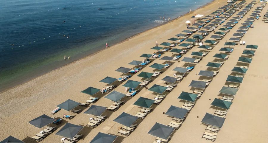 Собствен, пясъчно - чакълест. Чадъри, шезлонги и плажни кърпи на плажа и при басейна – безплатно.