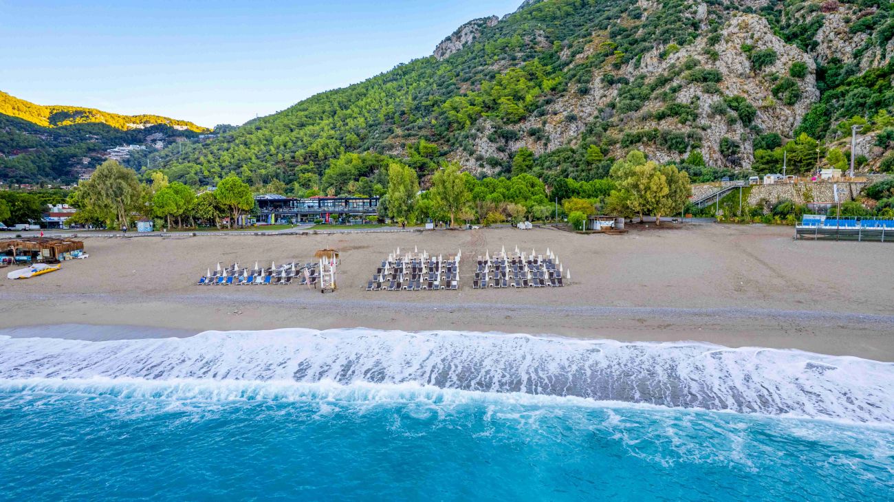 Собствен – пясъчен, на 50 м от хотела. Чадъри, шезлонги и матраци на плажа и при басейна – безплатно.