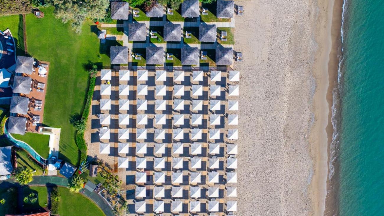 Собствен, пясъчно – чакълест, притежаващ сертификат „Син флаг“, кей. Чадъри, шезлонги и плажни кърпи на плажа и при басейна – безплатно.