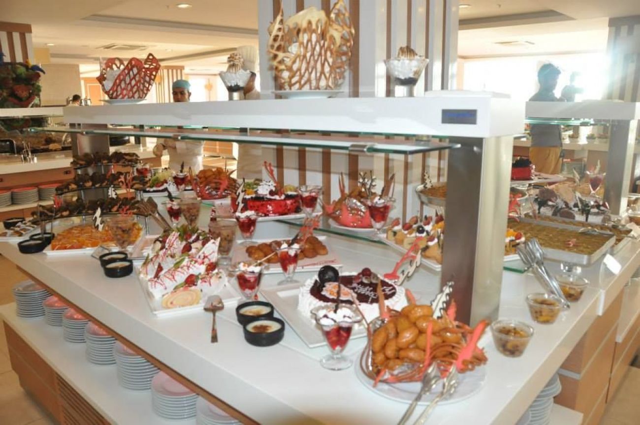 На територията на хотела 1 основен ресторант, 3 a la carte (турски, италиански и рибен – с предварителна резервация и едно посещение за целия период безплатно); 4 бара с анимация, бинго, караоке и др.