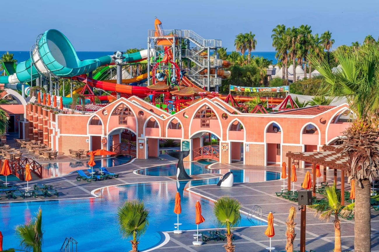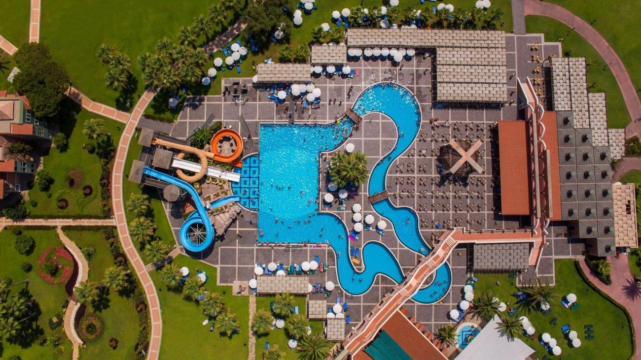 Club Mega Saray 5* е елегантен хотелски комплекс, заемащ обща площ от 121 680 кв.м. Намира се на 30 км от най-близкото международно летище в град Анталия, на 35 км от центъра на Анталия и на 7 км от селището Кадрие.