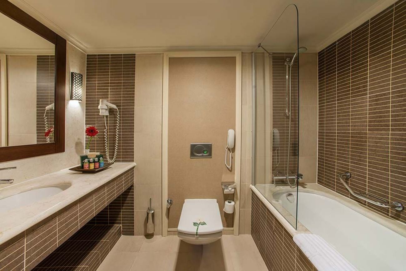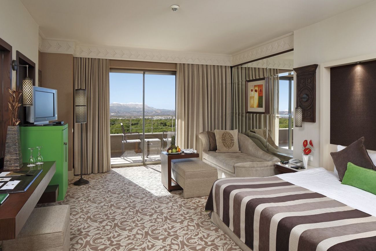 вана, сешоар, халат, чехли, плодове (в деня на настаняване), централен климатик, индивидуален климатик (за Villas), телевизор, телефон, мини-бар (безалкохолни напитки, мляко и бира се зареждат ежедневно, безплатно), сейф (безплатно), подова настилка - мокет (Superior Suite, Premier Suite мокет и паркет; Ela Prestige Suite, Еla Palace, Sultan Palace паркет и мрамор), балкон или тераса, безжичен интернет (безплатно), почистване на стаята - ежедневно, смяна на спалното бельо - ежедневно, room service (от 02:00 до 07:00 по меню - безплатно, за инвалиди - 24 часа (безплатно)), Интернет Wi-Fi (безплатно)