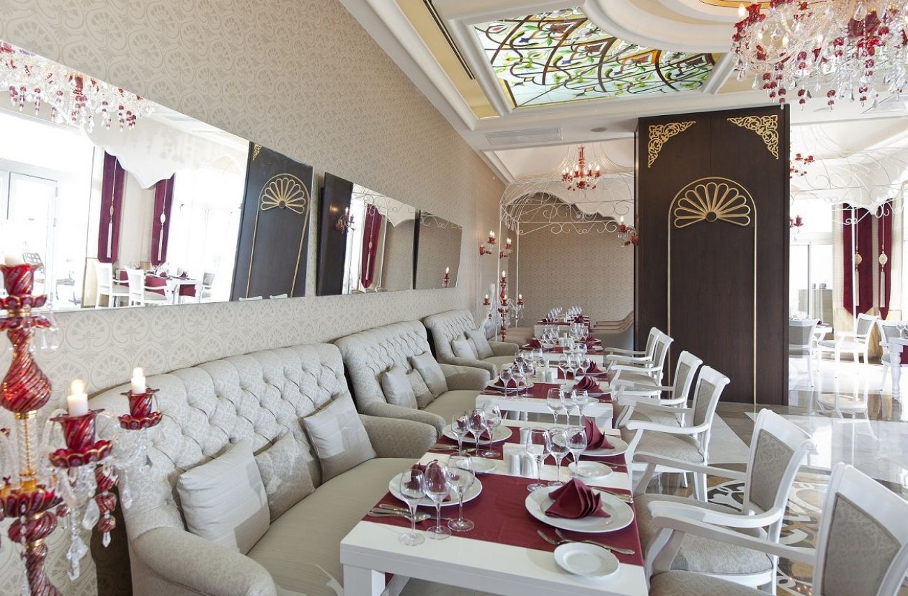 Работно време на основния ресторант: Закуска 07:00-10:00, следобедна закуска 10:00-11:00, обяд 12:30-14:00, вечеря 19:00-21:00. Бюфет. Нощен ресторант: късна вечеря / ранна закуска 21:30-07:00ч. През деня (12:00-18:00) се предлагат закуски в снек бара на плажа.